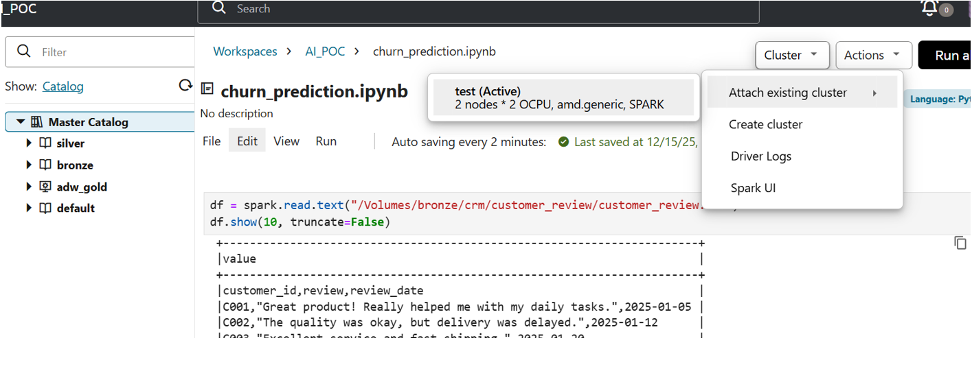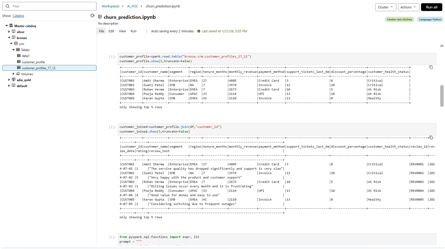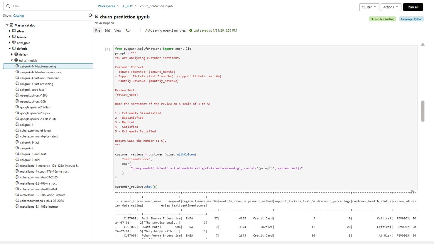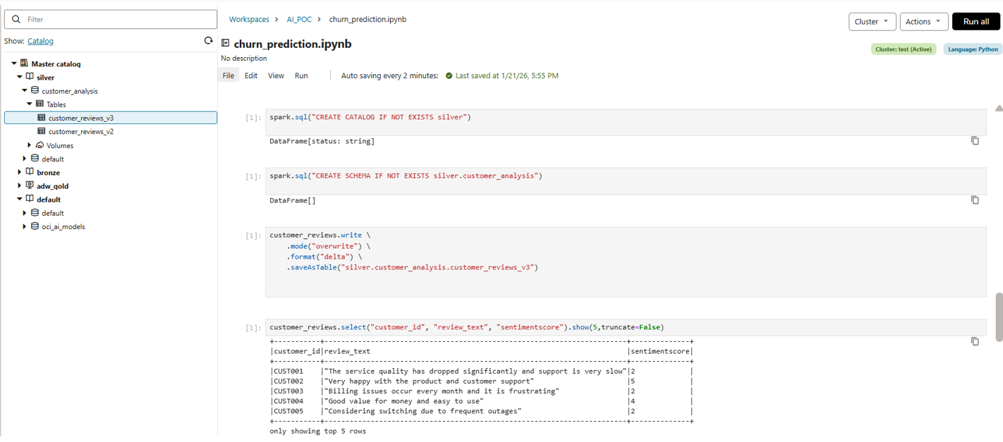 This blog highlights how Oracle AI Data Platform streamlines the customer churn analysis journey from ingesting raw data in the Bronze layer to generating actionable insights in the Gold layer. By integrating customer profiles with AI-powered sentiment analysis from unstructured reviews, organizations gain a more accurate and holistic view of churn risk.