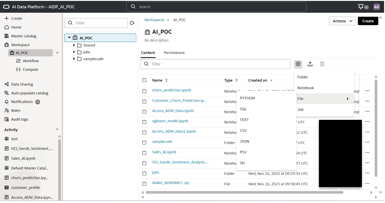 The customer review data from Object Storage is ingested and processed to extract meaningful insights such as sentiment and key phrases. This processed review data is then combined with the customer profile CSV data using a common customer identifier to create a unified dataset for churn analysis. Start with Creation of workspace.