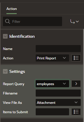 - • Print Report: Use this new dynamic action to leverage the OCI Document Generation Pre-Built Function to print pixel-perfect reports.