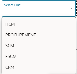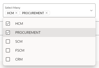 - •Select One page item displays as an item with a list of values icon which supports the selection of one value and search filtering.