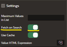 - • Fetch on Search: Specify whether matching values are retrieved from the database as the user types on the item. It retrieves matching records from the database each time the user types a character. Otherwise, all list values are loaded on page load.