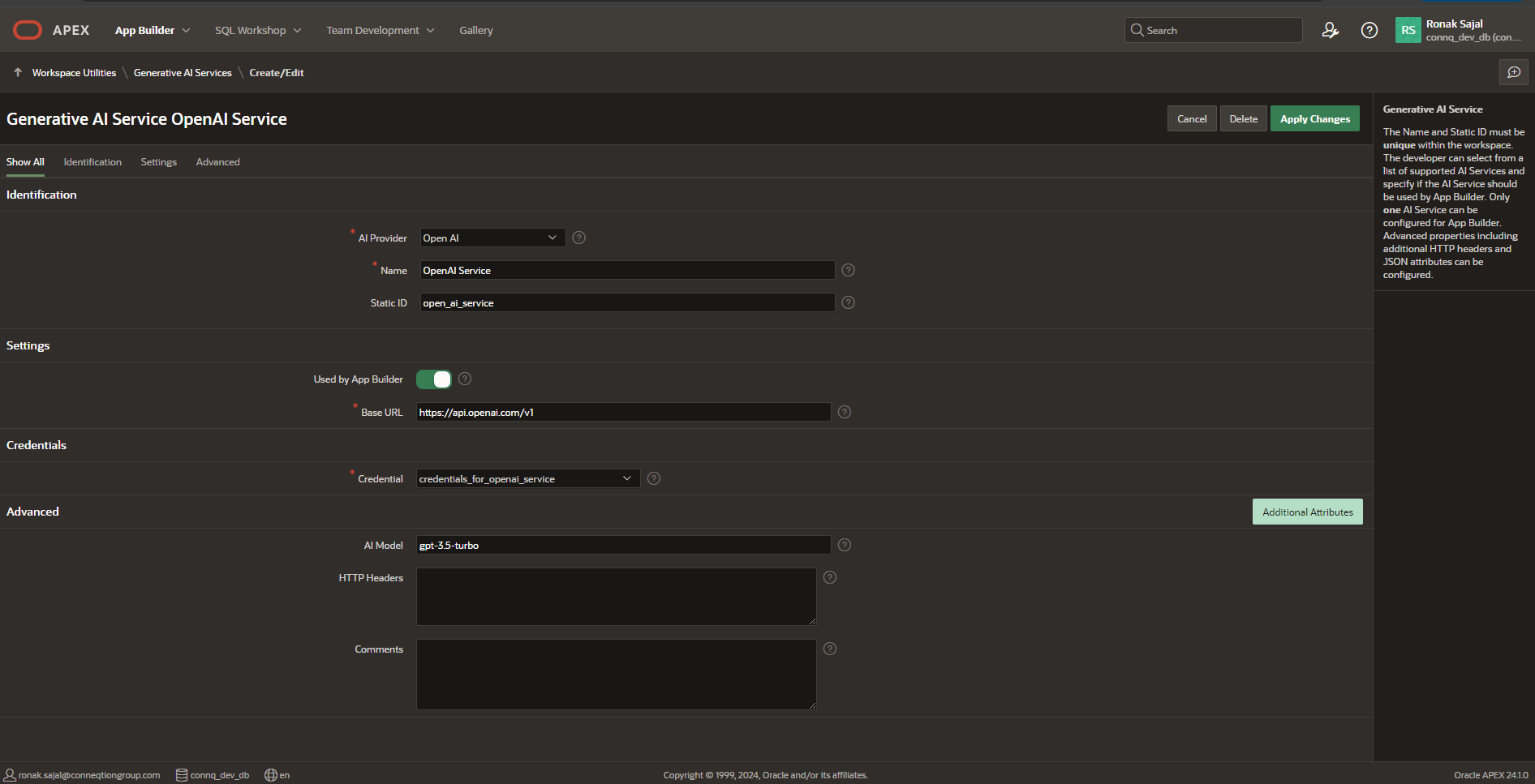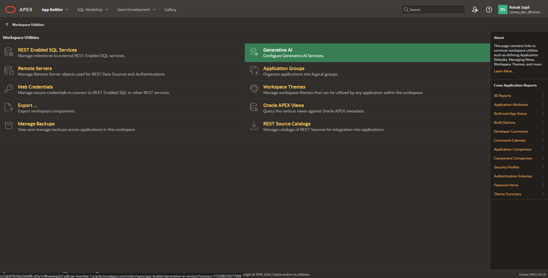 - •APEX 24.1 supports your own personal AI Assistant, which can be easily configured from the Generative AI section under the Workspace Utilities panel.