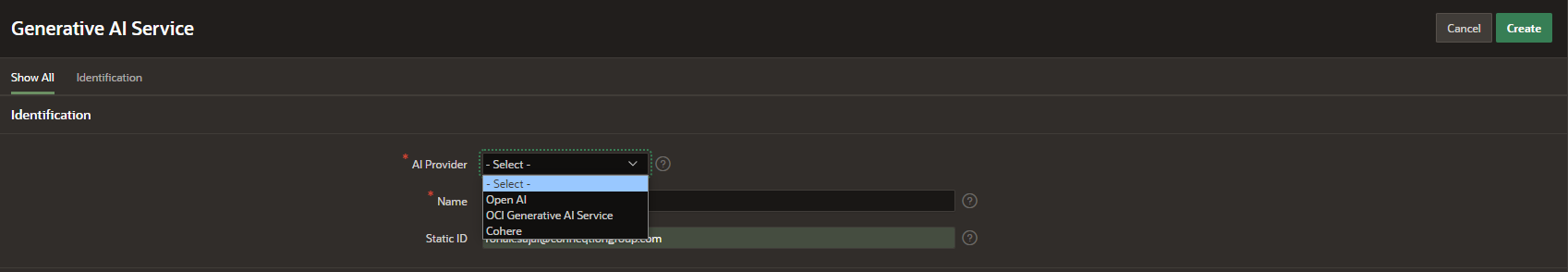 - •Configure your workspace by selecting one of the AI providers: Open AI, OCI (Oracle Cloud Infrastructure) Generative AI Service, or Cohere, and provide the necessary credentials to complete the configuration.