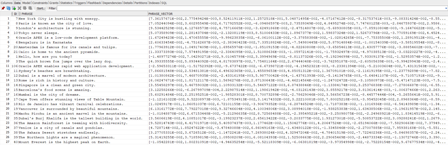 ( “ID” NUMBER, “PHRASE” VARCHAR2(1000 BYTE), “PHRASE_VECTOR” VECTOR )