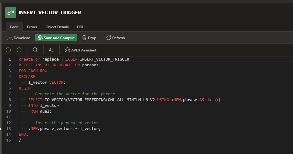 - •Now, we then create an on insert and update trigger, that generates the Vector value for the Phrase. We have also created a sequence and a trigger for auto-generation of ID (Primary Key).