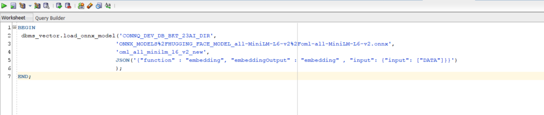 - •Load the ONNX model into the Database using ‘DBMS_VECTOR.LOAD_ONNX_MODEL’. We are using Hugging-face embedding model ‘sentence-transformers/all-MiniLM-L6-v2’.