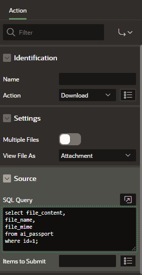 - • Download Action: This is a new dynamic action and a page process now available in 24.1. It allows you to download content directly. You can set it up to download single or multiple files as a zip archive. It supports CLOB/varchar2 datatype as file content.