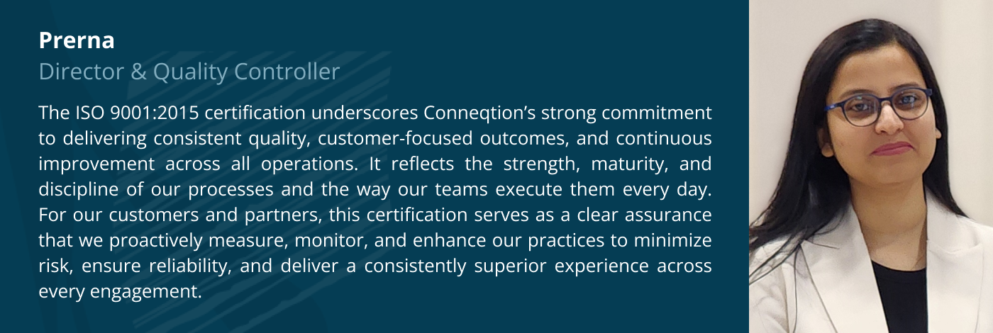 Conneqtion Consulting Private Limited reaffirms its strong commitment to delivering consistent, reliable, and customer-focused outcomes through the implementation of a robust Quality Management System (QMS) aligned with ISO 9001:2015 standards. This policy reflects our organization-wide dedication to operational excellence, continual improvement, and compliance with global quality benchmarks.