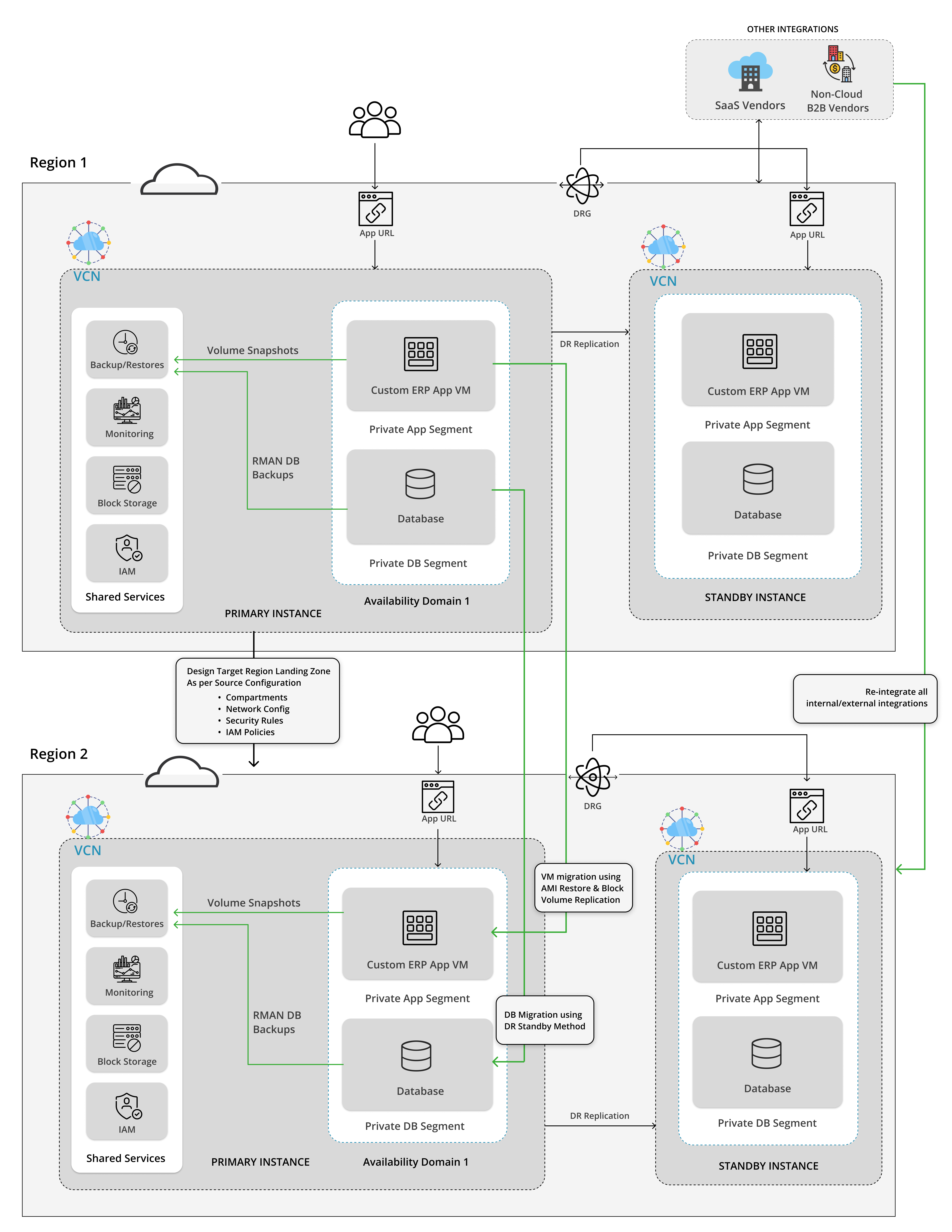 - Secure connectivity via DRG (Dynamic Routing Gateway) and service gateways for on-premises integration.